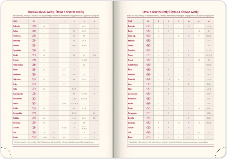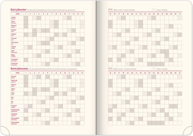 Cet agenda hebdomadaire allie style et fonctionnalité grâce à son design bleu et doré à effet métallisé et au millésime embossé. Il dispose d’éléments pratiques tels que coins arrondis, passant pour stylo et élastique de fermeture, assurant un usage confortable. L’agenda comprend une mise en page avec calendrier tchéco‑slovaque ainsi que d’autres langues comme l’anglais, l’allemand, le hongrois et le russe.
