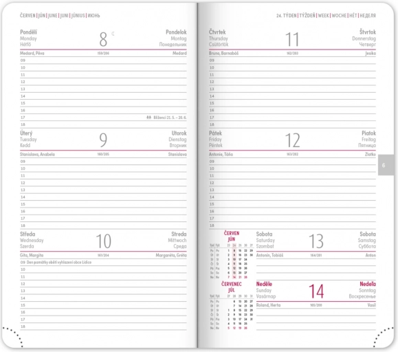 L’agenda Tomy 2026 propose une vue hebdomadaire avec un calendrier tchéco-slovaque, complété par l’anglais, l’allemand, le hongrois et le russe. Parfait pour les utilisateurs internationaux.