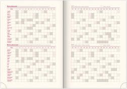 Éléments pratiques tels qu’un marque-page textile, des coins perforés et un espace pour les données personnelles et les notes.
