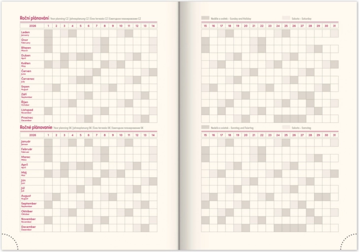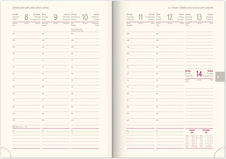 - Mise en page hebdomadaire avec calendrier tchéco-slovaque et langues complémentaires : anglais, allemand, hongrois et russe.