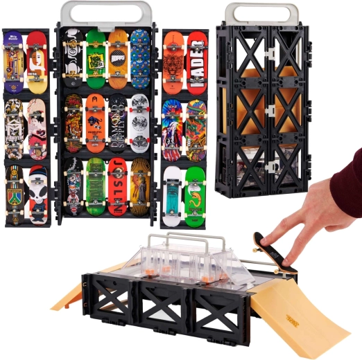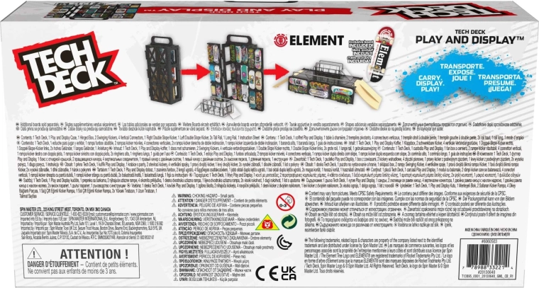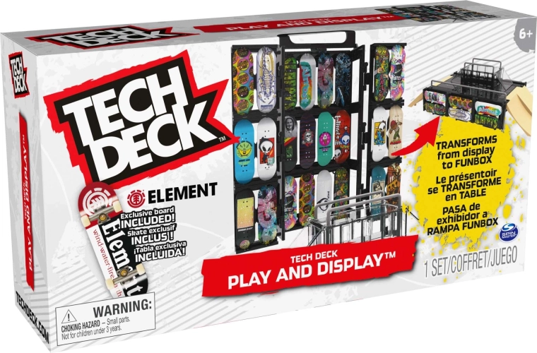 Tech Deck Play and Display est une solution 2-en-1 ingénieuse : présentoir et étui de rangement pour ta collection, ainsi qu’un skatepark fingerboard complet pour les figures. La structure type caisse se déploie facilement en funbox avec rampes et barres de grind, pour rider à la maison comme en déplacement. Un fingerboard stylé ELEMENT est inclus pour rouler immédiatement.