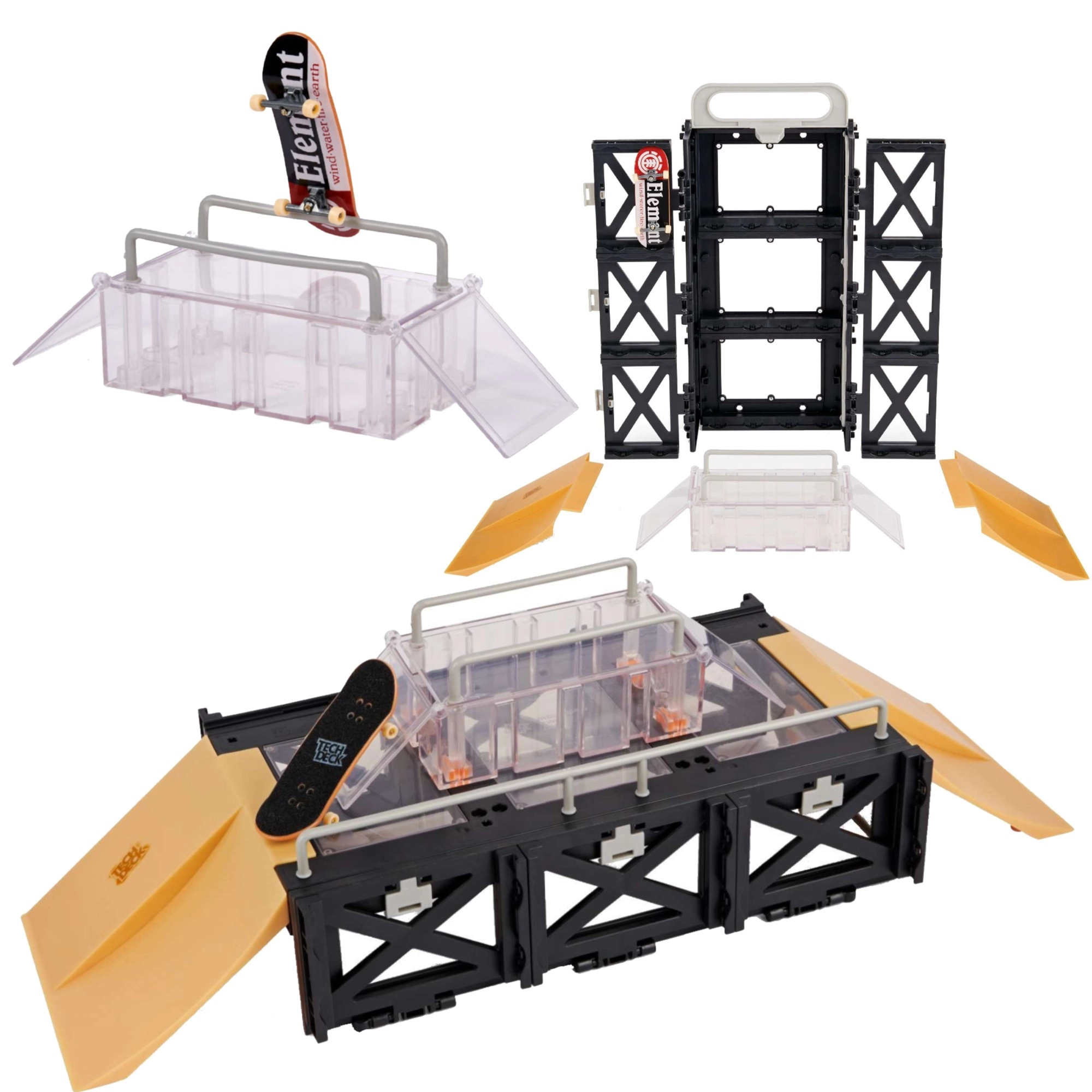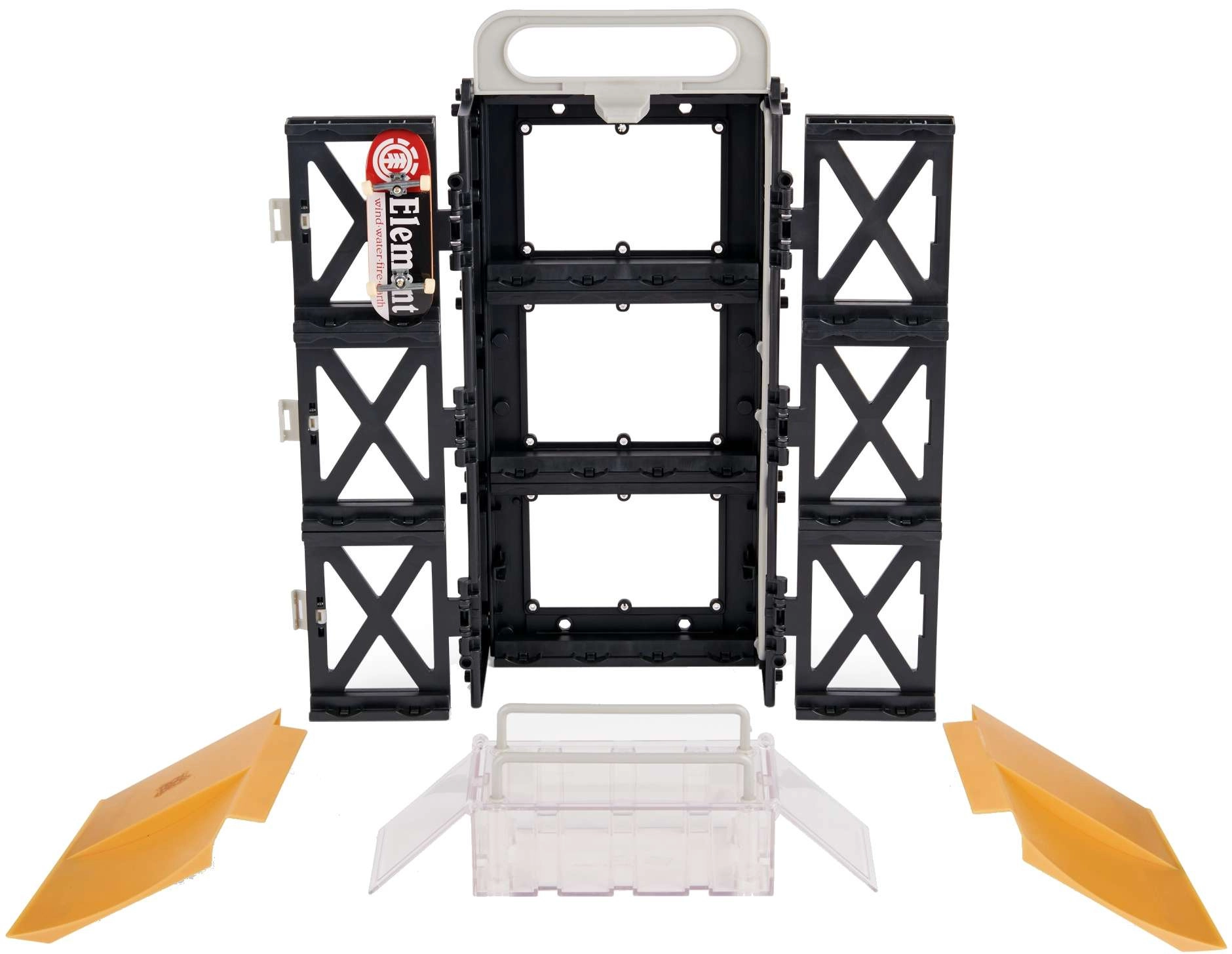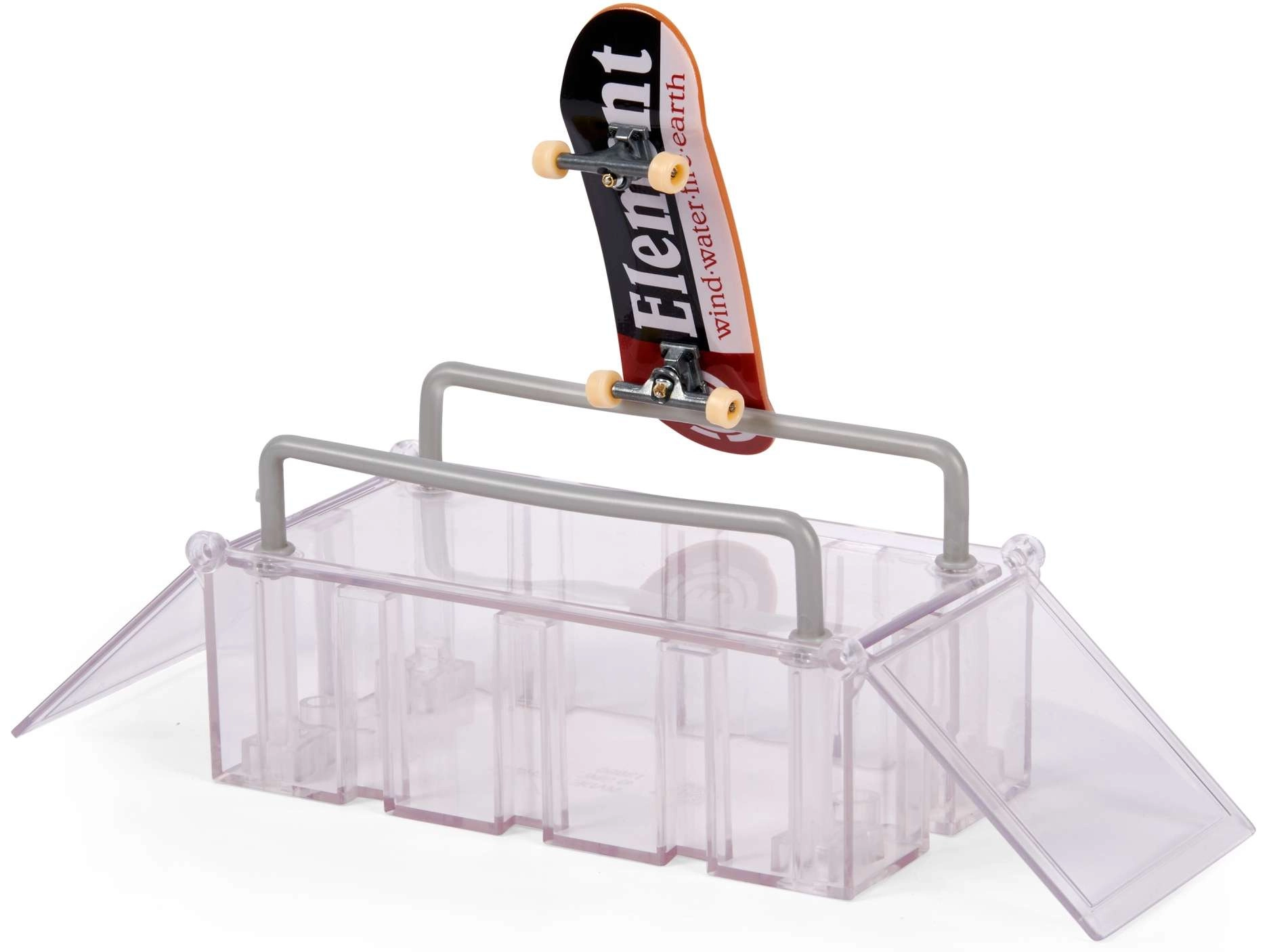 - 1× fingerboard Tech Deck ELEMENT, 1× étui/présentoir, box avec charnières, 2× kickers rabattables, 4× connecteurs verticaux, 1× kicker droit à double descente, 1× kicker gauche à double descente, 2× barres hautes, 1× longue barre, notice