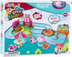Cette configuration inclut divers accessoires comme une table avec parasol, des desserts glacés ou un chariot pour transporter les gourmandises. L’enfant peut observer le hamster en serveur ou livreur apportant des glaces aux clients, ou se déplaçant librement sur la piste selon ses propres trajets. Tous les éléments sont travaillés avec le souci du détail, et la surface en fourrure douce du hamster invite à l’interaction.