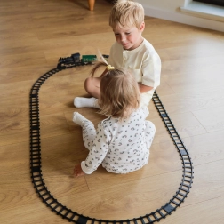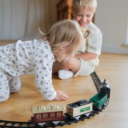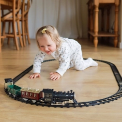 Ce train à vapeur traditionnel offre aux enfants une expérience authentique de voyage en train. La locomotive possède un phare lumineux et des sons réalistes qui renforcent l’ambiance de jeu. Les rails se clipsent facilement, vous permettant de monter en un rien de temps un circuit de 74 cm de diamètre ou un ovale de 134 × 74 cm.