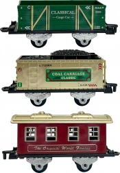 Le set comprend une voiture voyageurs, un wagon à charbon et un wagon de fret pour des histoires de transport variées.