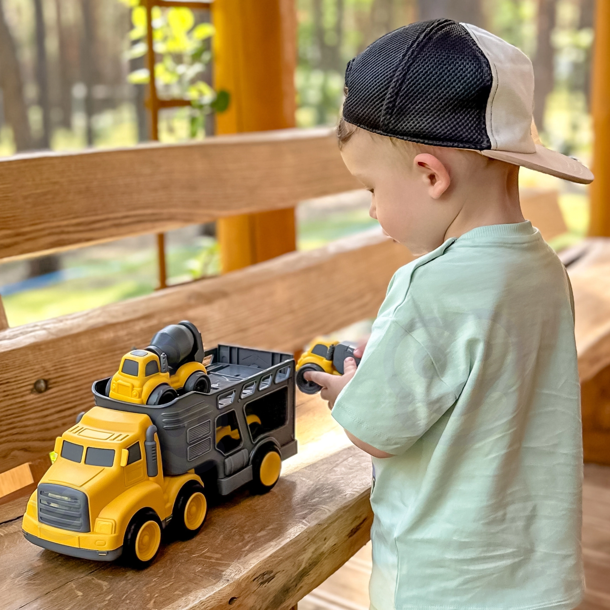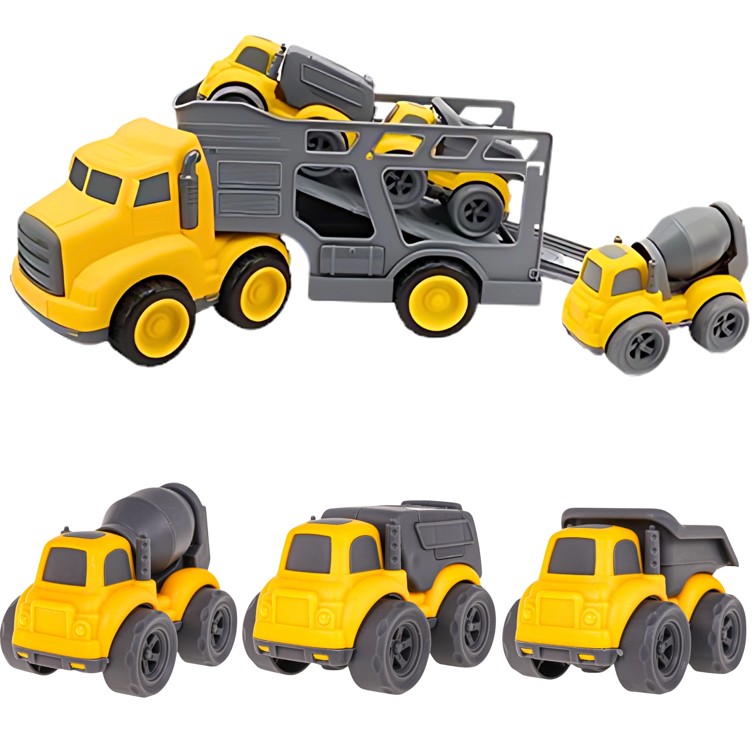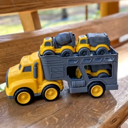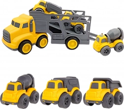 - 4-en-1 : grand porte-engins + 3 véhicules de chantier