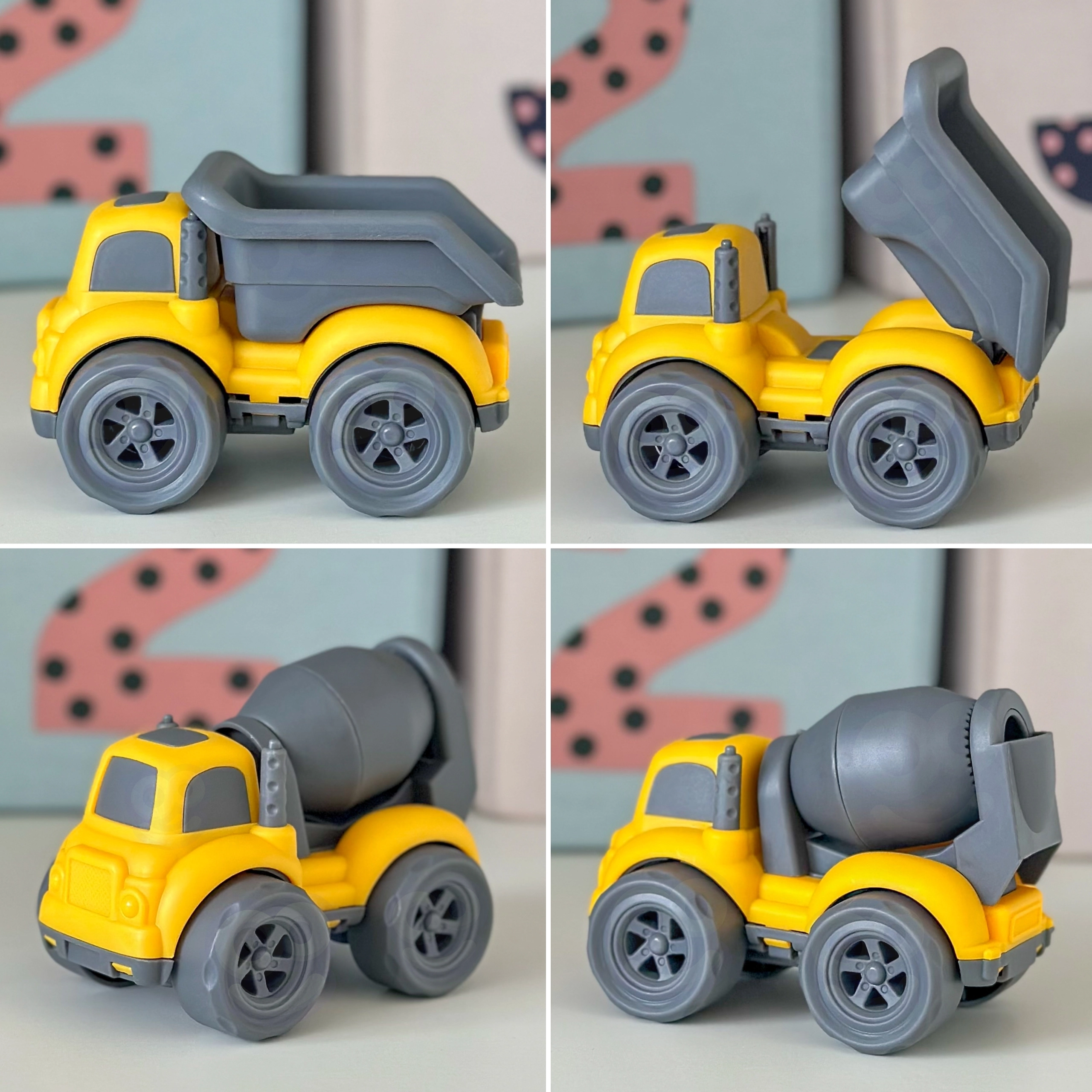Tombereau avec benne basculante, bétonnière à tambour rotatif et camion-benne pour des scénarios de chantier encore plus réalistes.