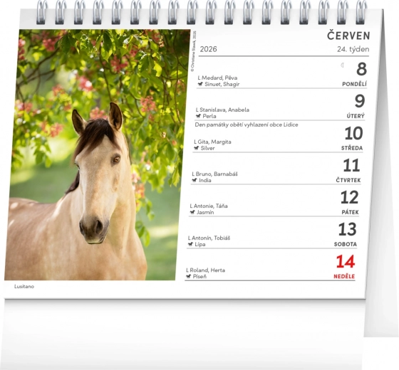 Calendrier de bureau Poésie des chevaux 2026 avec photographies et espace pour les notes, noms de chevaux pour chaque jour, dimensions 16,5 x 13 cm.