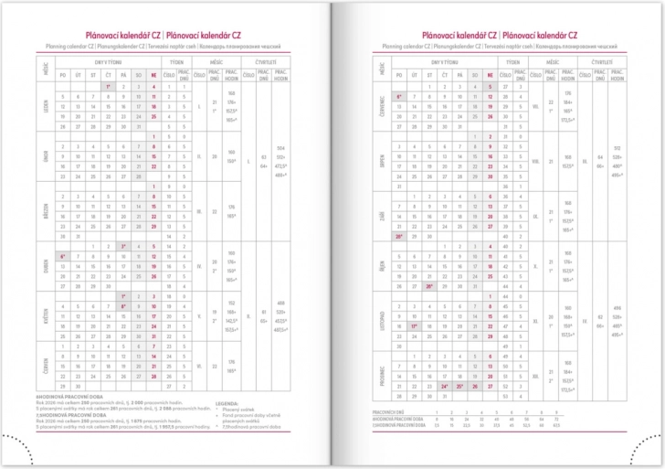 - Une disposition hebdomadaire avec un calendrier tchéco-slovaque et des versions complémentaires en anglais, allemand, hongrois et russe.