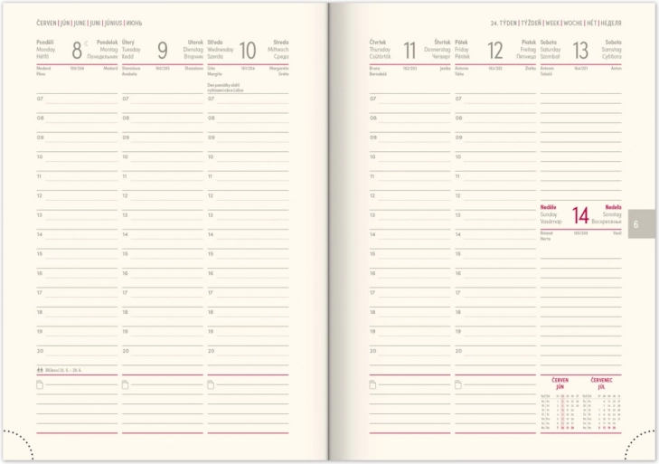 Agenda moderne et élégant avec une mise en page hebdomadaire dans un calendrier tchéco-slovaque. Équipé d’un élastique solide et d’un porte-stylo.