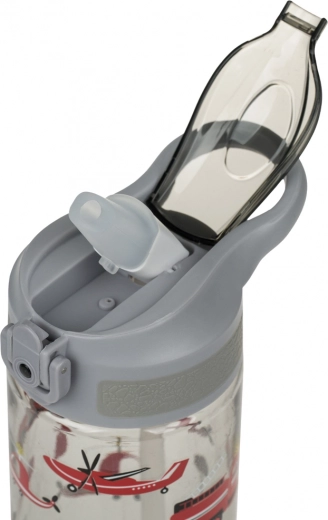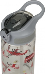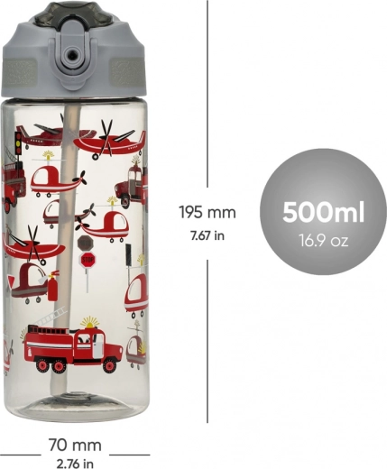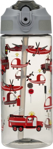 Bouteille en plastique transparente avec des images de camions de pompiers rouges et d’hélicoptères, parfaite pour s’amuser à chaque gorgée.