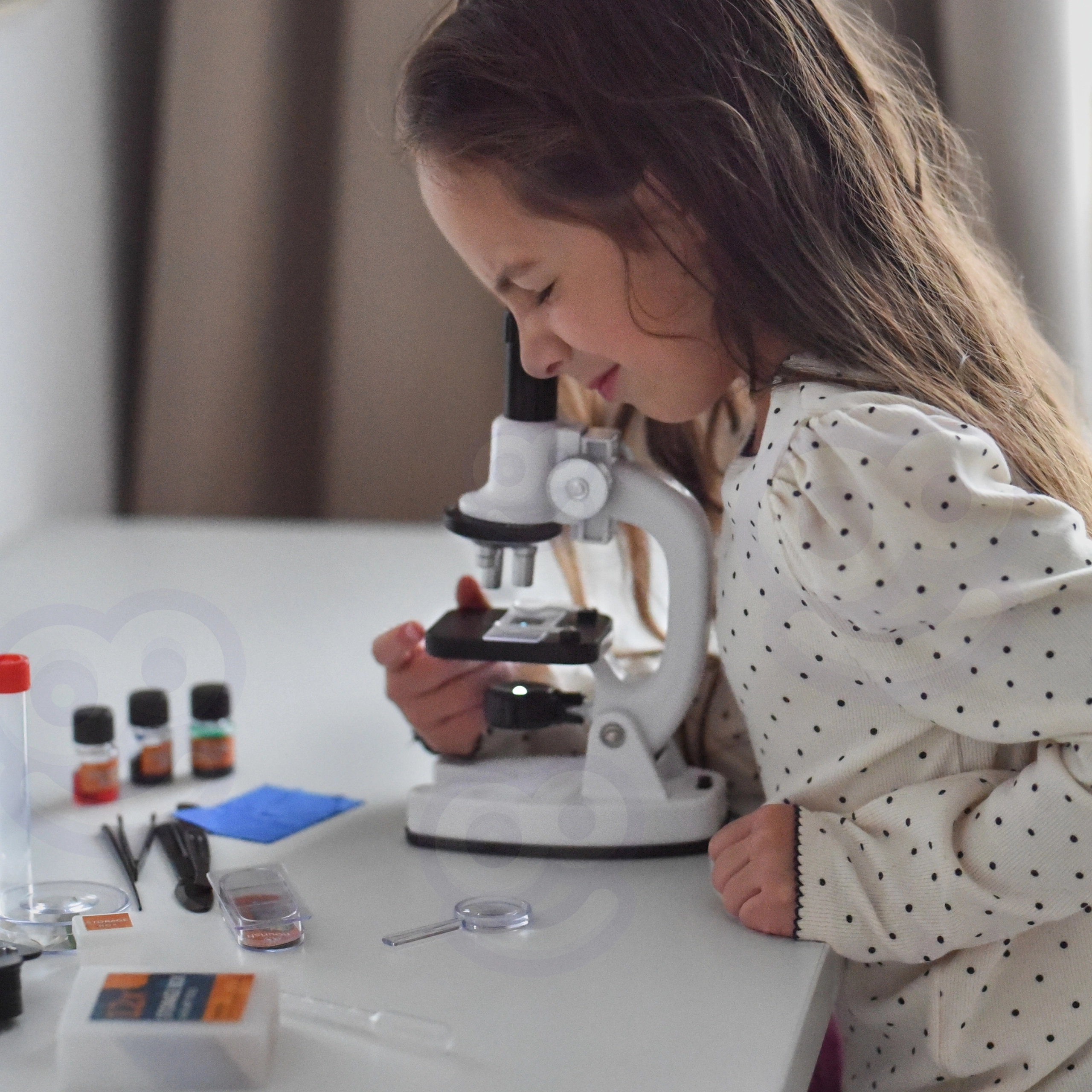 Un adaptateur pour smartphone est inclus, ce qui permet de photographier et partager facilement les observations. Le riche ensemble d’accessoires (lames, flacons, pince, pipette et plus) favorise des expériences sûres et ludiques et développe les compétences scientifiques, la patience et la coordination œil-main.