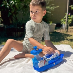 Il suffit de pousser légèrement le bateau pour qu’il avance grâce au mécanisme à friction. Idéal pour jouer sur le tapis ou le sol. Le jouet ne flotte pas.