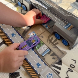 Le camion fonctionne comme un transporteur mobile et comme une mallette pour ranger les petites voitures et les accessoires. Les enfants emportent ainsi facilement l’ensemble partout avec eux.