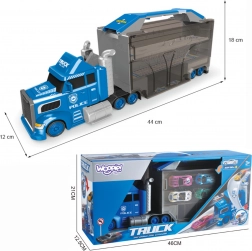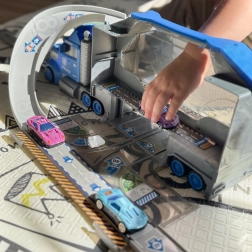 Le grand camion de police de la marque WOOPIE se transforme en un instant d’un ensemble de transport pour petites voitures en un véritable kit de course avec garage et piste. En ouvrant la remorque, on découvre une zone de jeu intérieure avec rampes, boucles et panneaux, où les enfants peuvent organiser des courses et duels palpitants.