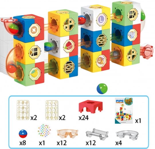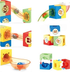 Reliez blocs et tubes transparents pour créer vos propres pistes à plusieurs étages. Les enfants développent créativité, logique et sens de la planification.