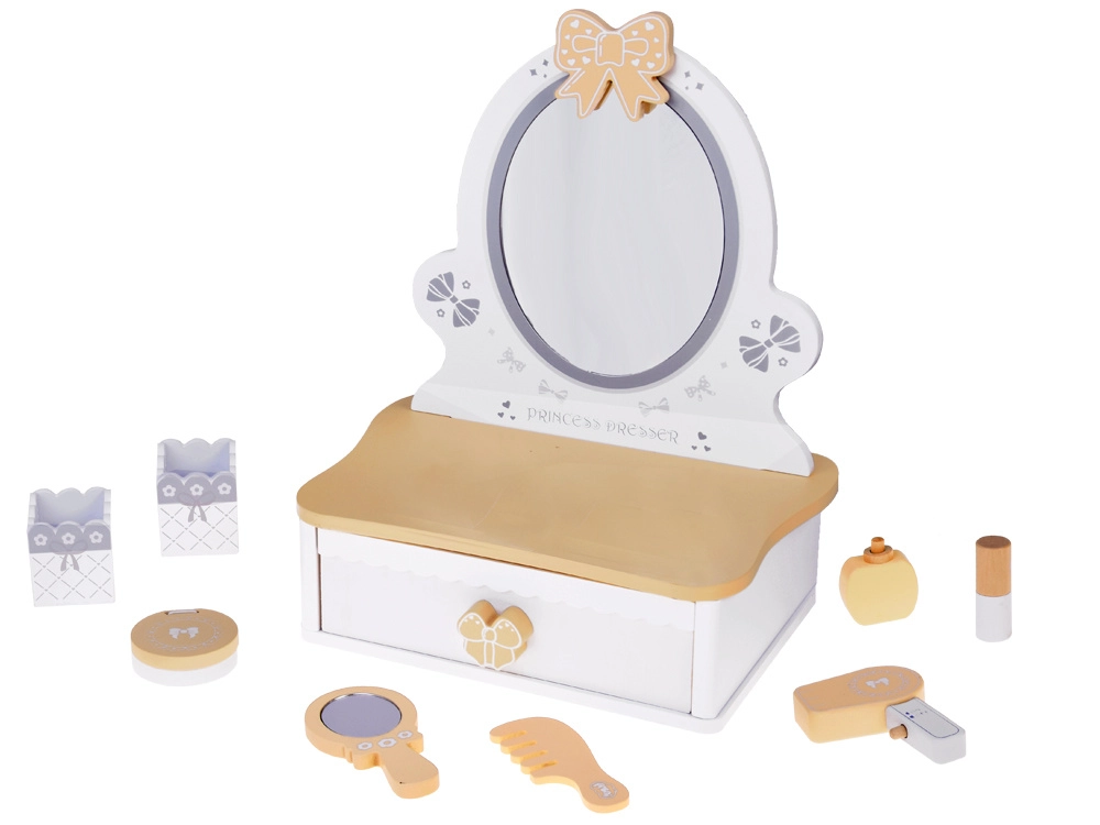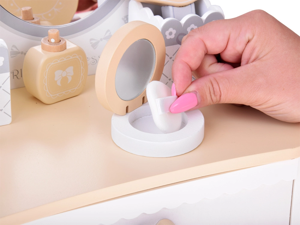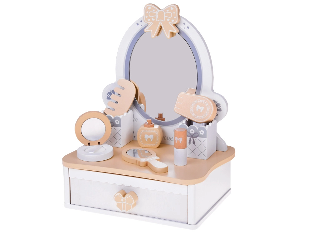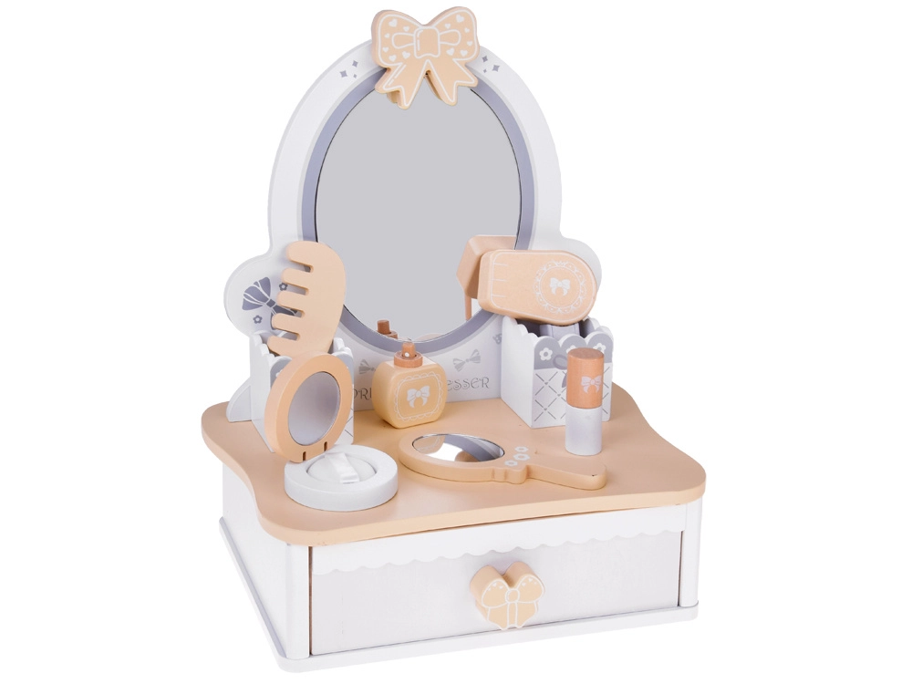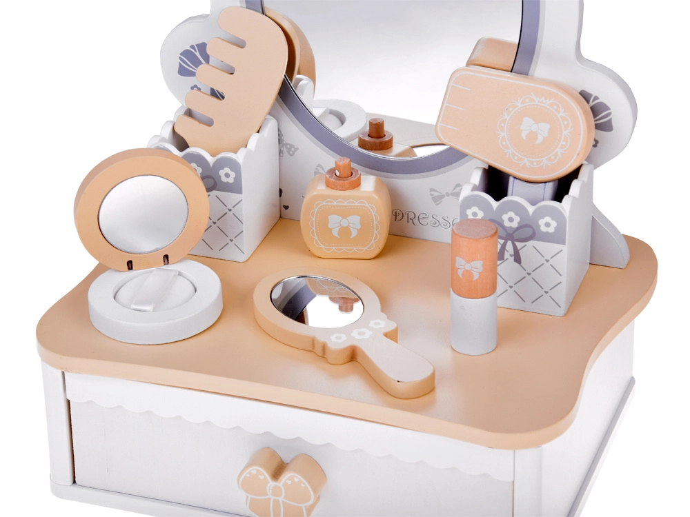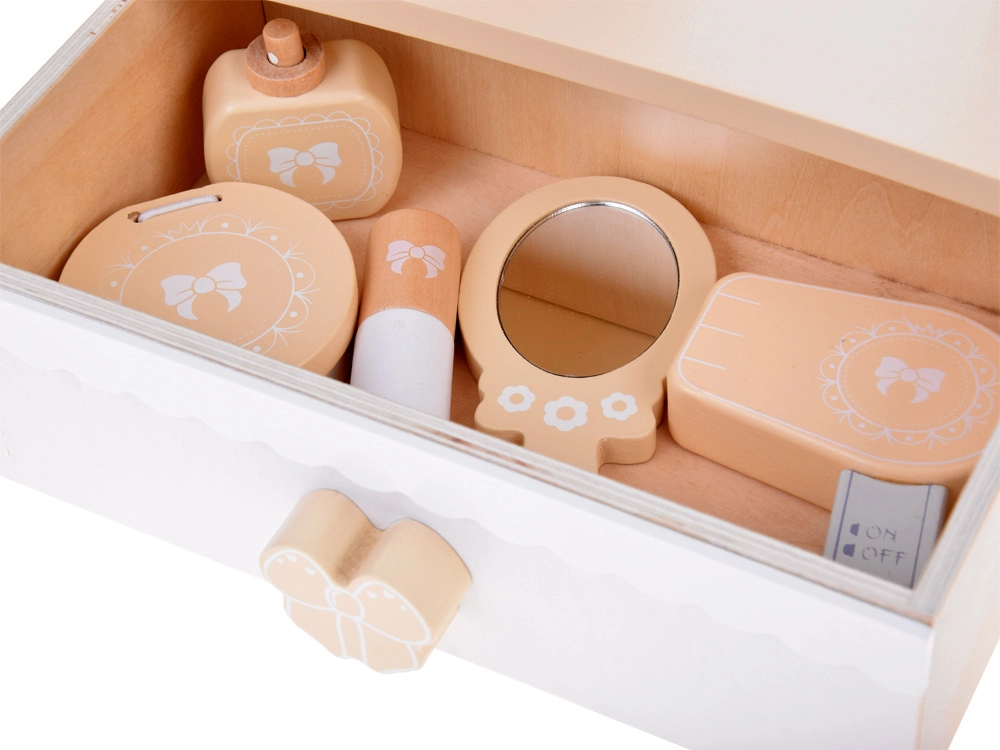 Les enfants apprécieront le riche ensemble d’accessoires – miroir à main, sèche-cheveux, peigne, poudrier avec houppette, parfum et rouge à lèvres. Ce sont de jolies répliques en bois conçues pour un jeu sûr et créatif. Le tiroir et les deux boîtes aident à maintenir l’ordre et apprennent aux enfants l’autonomie et l’organisation.