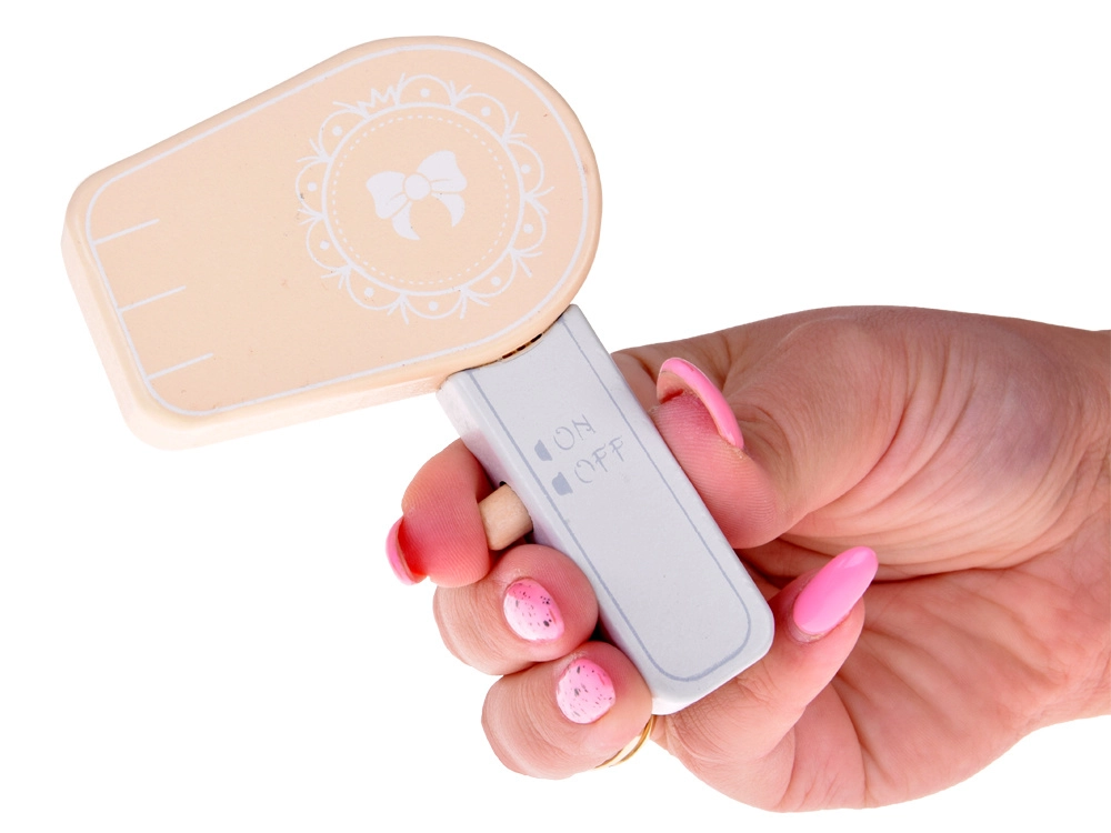 Comprend un miroir à main, un peigne, un sèche-cheveux, un poudrier, un parfum et un rouge à lèvres – tous en accessoires en bois. Les enfants développent leur motricité fine et leur imagination en « prenant soin d’eux comme les grands ».