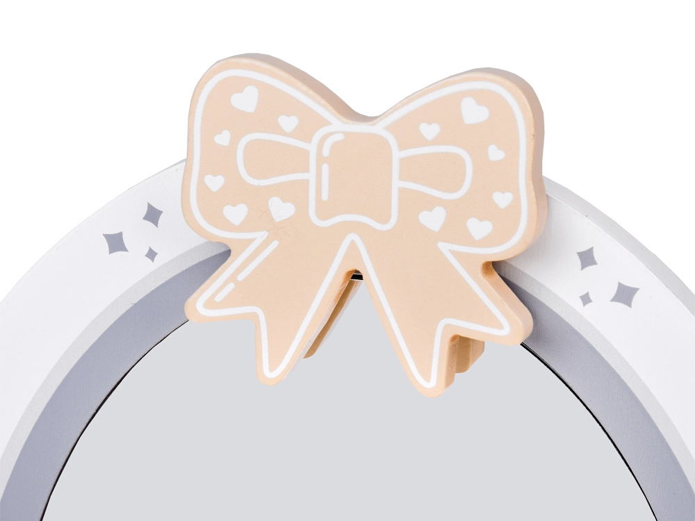 Le miroir décoratif avec un joli nœud et de petits cœurs apporte du charme à la pièce et invite les enfants à des jeux imaginatifs devant la « coiffeuse ». Sa conception sûre et ses surfaces lisses conviennent parfaitement à un usage quotidien.