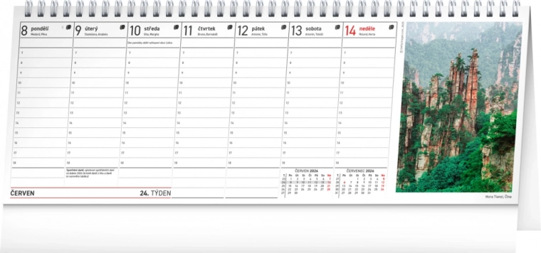 Calendrier pour l’année 2026 qui marie harmonieusement fonctionnalité et esthétique. Il comprend un calendarium hebdomadaire tchèque avec espace pour les notes, les prénoms, les fêtes et les journées importantes.