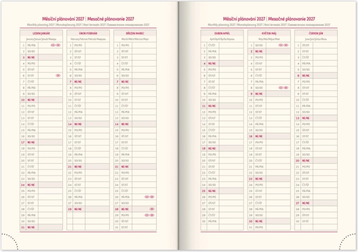 Élégant agenda rose NOTIQUE Rivoli pour l’année 2026, conçu pour l’utilisateur moderne. Il comprend un élastique de fermeture, un porte-stylo et une mise en page quotidienne avec un calendrier tchéco-slovaque complété par l’anglais, l’allemand, le hongrois et le russe.