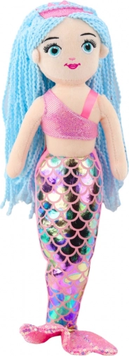 La sirène affiche un léger sourire sur un visage brodé et porte un top en brocart asymétrique ainsi qu’une tiare rose. Sa conception douce et légère en fait une compagne idéale pour les câlins, le jeu créatif ou comme décoration dans une chambre d’enfant.