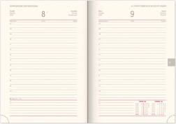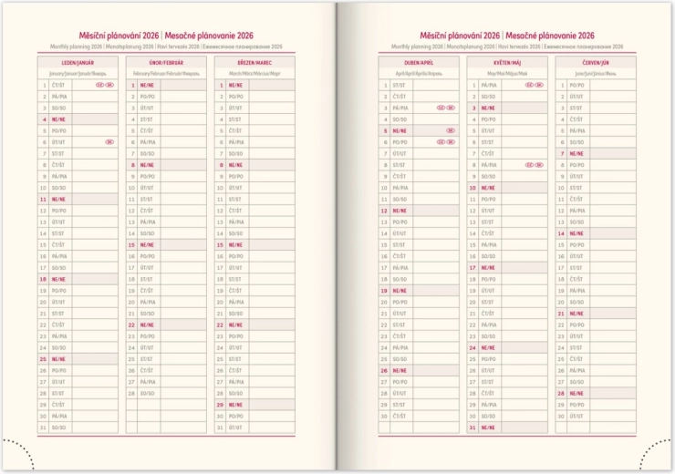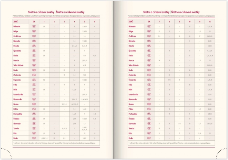 Design moderne avec un élastique solide et un porte-stylo. Contient un calendrier tchéco-slovaque et des compléments en anglais, allemand, hongrois et russe.