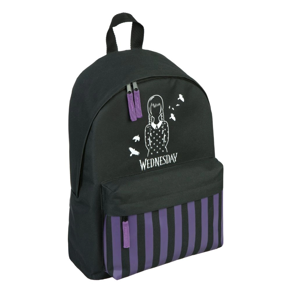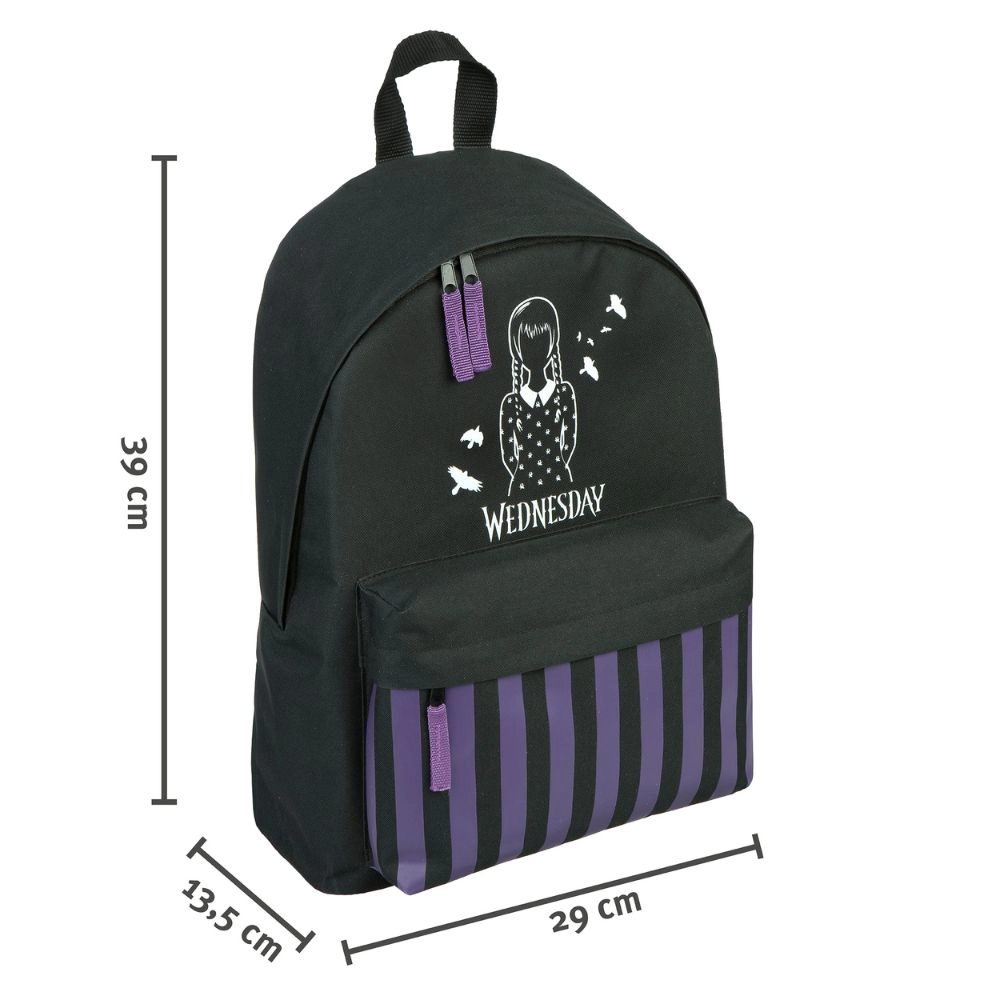 Style distinctif et praticité se conjuguent dans le sac à dos avec motif Wednesday. Parfait pour l'école et les sorties, il offre un compartiment principal spacieux et une poche avant plus petite.