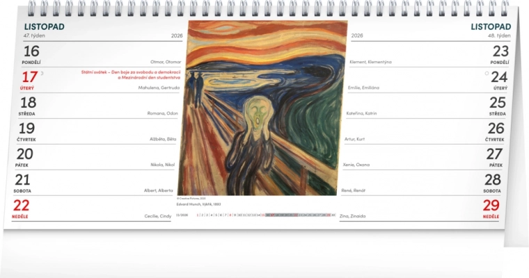 Profitez de la beauté de divers genres et motifs dans le calendrier de bureau Art 2026. Ce calendrier propose un calendrier tchèque, les jours fériés, les journées commémoratives et les phases lunaires mensuelles dans une présentation claire sur deux semaines.