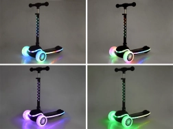 Cette trottinette d’équilibre à trois roues est idéale pour les premières balades en plein air. La direction par inclinaison (lean-to-steer) aide les enfants à développer intuitivement coordination et équilibre, tandis que la large surface de marche antidérapante assure de la confiance à chaque poussée. Les roues avant, le cadre et le marchepied sont équipés d’un éclairage LED proposant de nombreux effets, et le module musical intégré ajoute encore plus de fun.