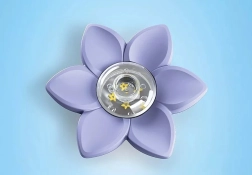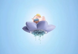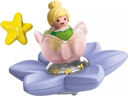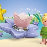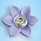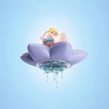 La fleur flotte sur l'eau et son ombilic transparent se remplit d'eau. Avec effet de pluie, poussière de fée tourbillonnante et fenêtre pour observer le fond de la baignoire.