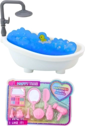 L’élément principal du set est une baignoire spacieuse et blanche avec une mousse réaliste et un canard en caoutchouc. Elle est accompagnée d’accessoires de beauté comme une brosse, un miroir, un sèche-cheveux et d’autres indispensables qui enrichissent le jeu avec des rituels quotidiens d’hygiène et de détente.