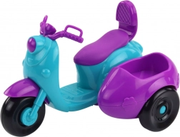 La poupée se déplace sur un scooter tricycle aux couleurs intenses turquoise et violet. Une remorque sur le côté du scooter abrite un petit chien avec un collier rouge – un compagnon fidèle pour chaque voyage. Le set est fabriqué en plastique durable et sûr, idéal pour le jeu quotidien.