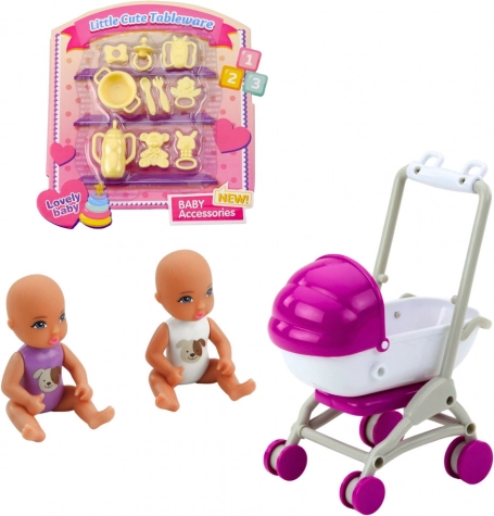 poussette avec canopy, deux figurines bébé, accessoires pour enfants