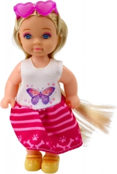 Ce charmant ensemble transporte les enfants dans un monde de soins attentionnés et de jeux ludiques avec des animaux de compagnie. La poupée de 12 cm porte une tenue colorée : un t-shirt blanc à motif papillon, une jupe rose à empreintes de pattes et des chaussures jaunes. Elle porte aussi sur la tête des lunettes roses en forme de cœur qui lui donnent une forte personnalité.