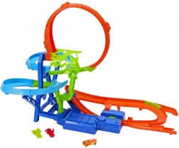 Cette piste d’action Hot Wheels offre une course rapide avec looping, sauts et possibilité de collisions entre voitures. Le boosteur motorisé assure un fonctionnement continu et, grâce au sélecteur de direction, vous adaptez aisément les défis et le déroulé de la course. Ajoutez d’autres voitures 1:64 et voyez qui franchit le looping le plus vite – et quand surviendra la collision palpitante.
