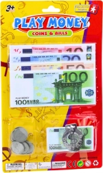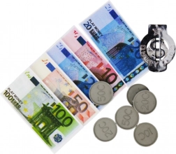 La boîte contient des billets colorés de différentes valeurs et des pièces en plastique représentant les centimes et les euros. Le tout est présenté dans un emballage blister coloré de type euro-perforation, pratique pour le rangement et la présentation du produit. Ce set est idéal pour les jeux de maison, de magasin ou de restaurant et constitue également un excellent support didactique en maternelle et à l’école primaire.