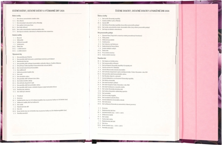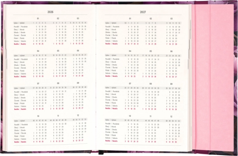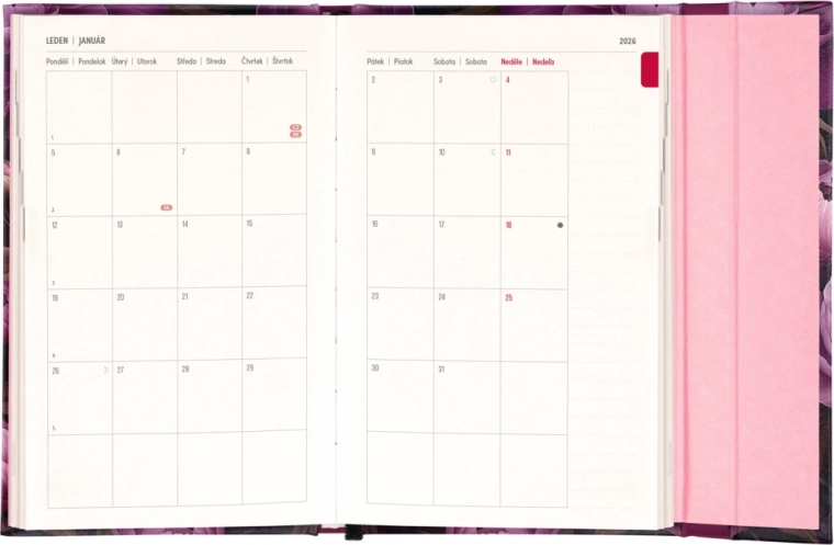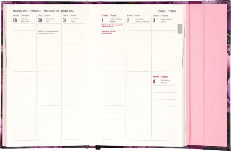 L’agenda Notique Fleurs violettes est non seulement esthétiquement agréable, mais aussi hautement fonctionnel. Il inclut des vues mensuelles, idéales pour planifier vacances et congés. Il comprend en outre la liste des fêtes tchèques et slovaques ainsi que des prénoms, afin que vous soyez toujours prêt.