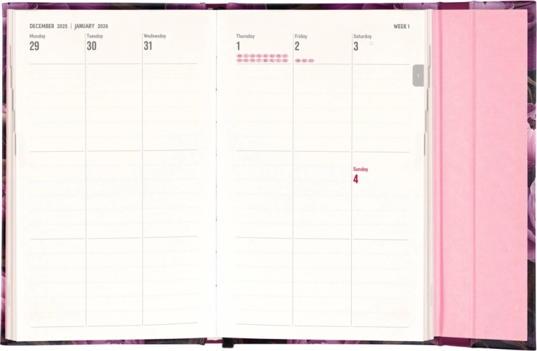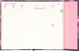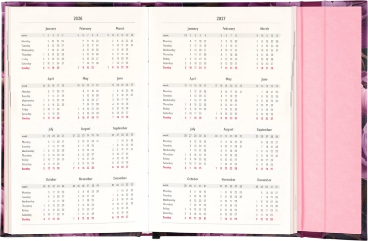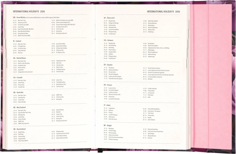Elle comprend également des aperçus mensuels, idéaux pour planifier les vacances ou les congés. L’agenda est non seulement pratique, mais grâce à son design aux motifs de fleurs violettes, c’est aussi un accessoire stylé pour votre bureau.