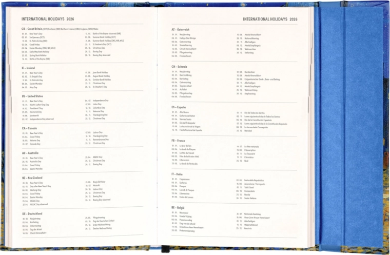 Le format 13 x 21 cm est idéal pour le sac ou le sac à dos. Il inclut également les jours fériés internationaux, utile pour les utilisateurs qui voyagent souvent ou ont une clientèle internationale.