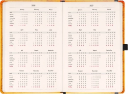 La première moitié contient un calendrier bimensuel horizontal avec jours fériés internationaux.