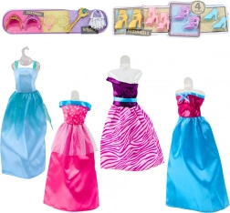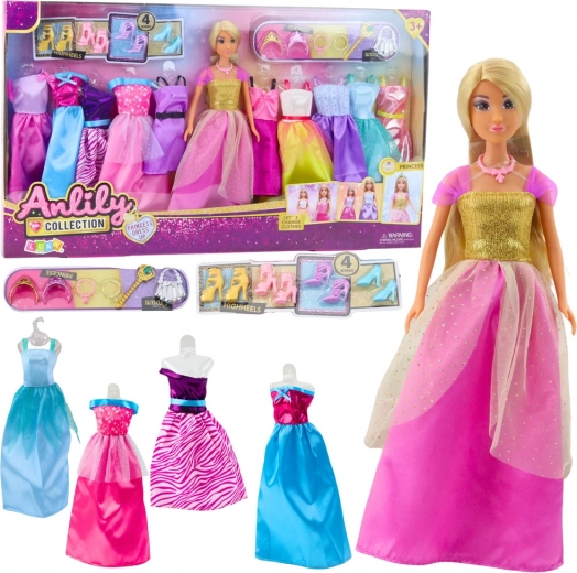 L'ensemble comprend également une large gamme d'accessoires : 4 paires de chaussures, 2 couronnes, 2 colliers, une baguette magique et un sac à main, permettant à la poupée de devenir princesse, mannequin, ou héroïne de ses propres contes. Ce set de jeu complet est la parfaite manière de permettre aux petites filles de développer leur imagination et de s'amuser dans des jeux de rôles.