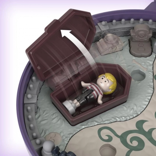Le compact avec portrait « hanté » en relief se transforme, une fois ouvert, en une maison détaillée avec cour, cheminée, escalier et pièces thématiques pour des histoires sans limites.