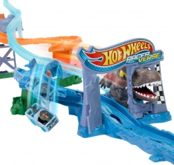 - Montez votre course et découvrez où finit le RacerVerse Vélociraptor lorsque le Spinosaure attaque et le « avale », l’éliminant ainsi de la partie. La piste compacte et facile à remonter vous permet de recommencer la course encore et encore.