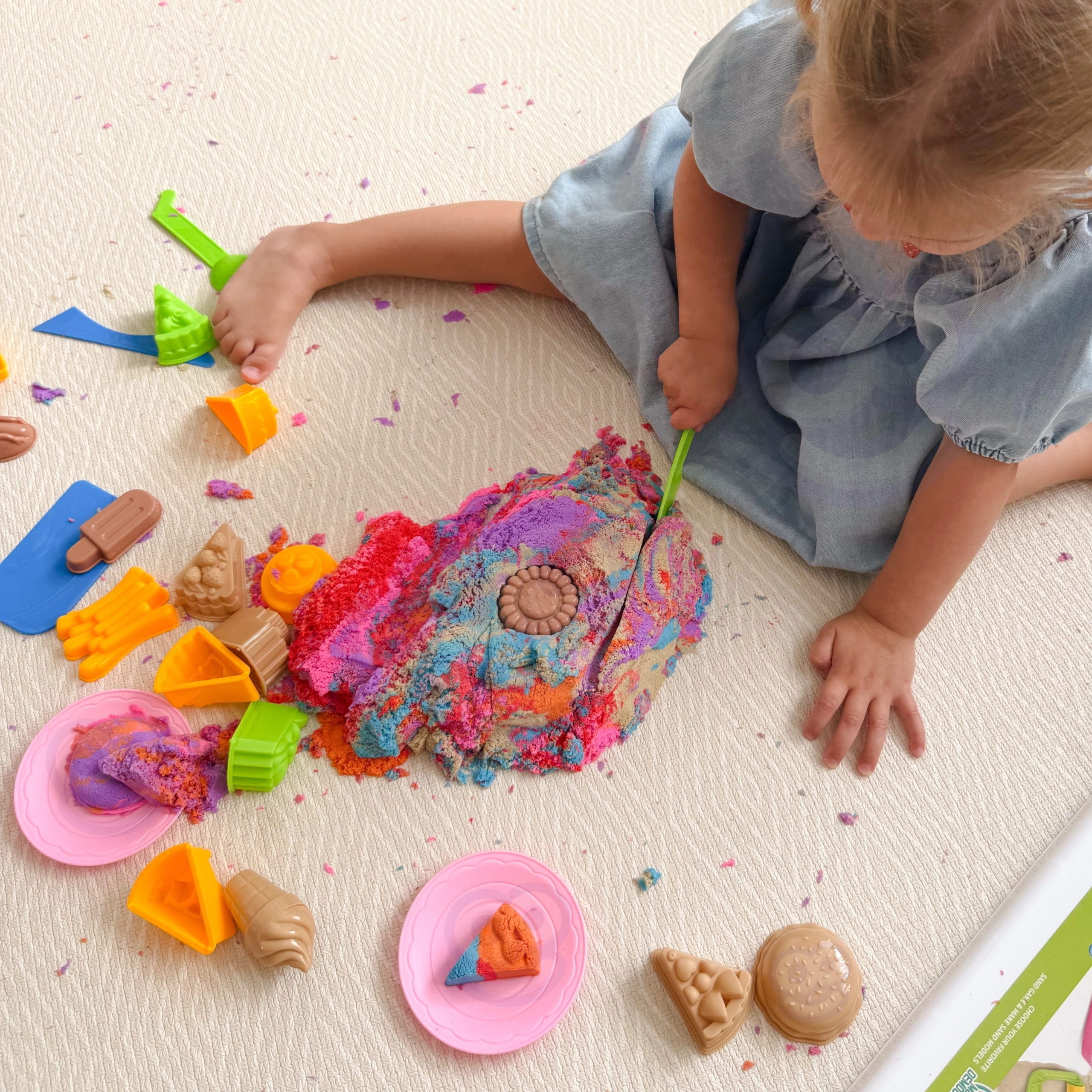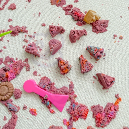La composition spéciale du sable est agréable au toucher, se coupe, se roule et se presse facilement dans les moules, tout en ne séchant pas et en gardant sa forme. Les enfants peuvent « cuisiner » et servir des desserts dans des assiettes, utiliser des pelles, des couteaux et un rouleau, et créer des textures détaillées avec les accessoires de pressage.
