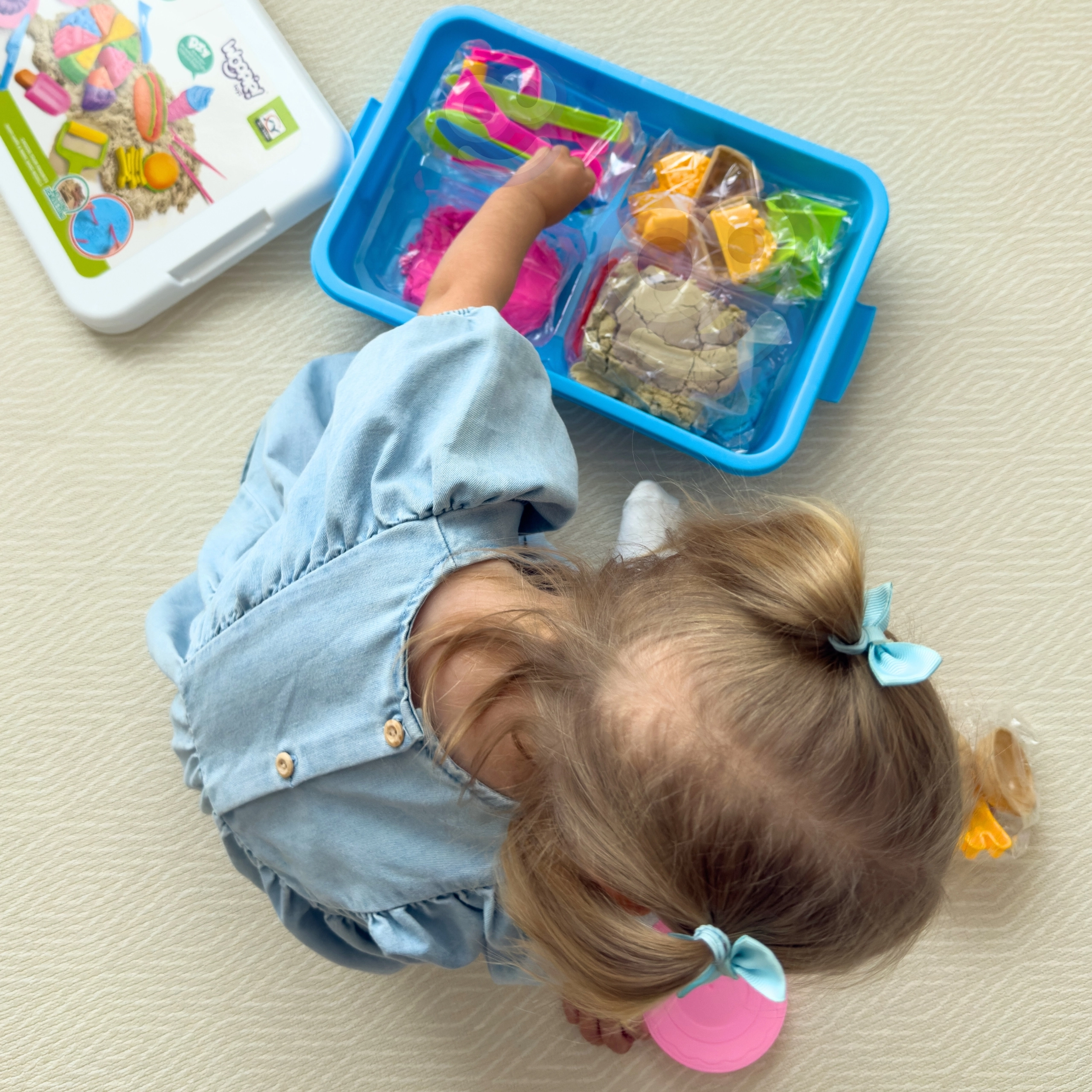 Le sable est doux, malléable, ne sèche pas et ne colle ni aux mains ni aux surfaces. Il favorise la motricité fine, la coordination et l’imagination.