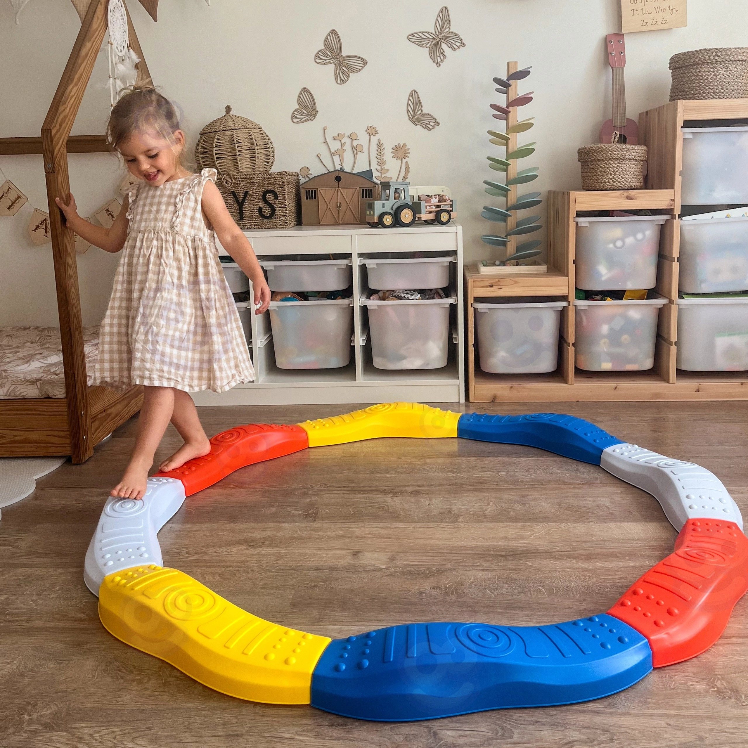 Apportez du mouvement et du plaisir aux enfants avec un parcours sensoriel d’équilibre modulaire en forme de cercle de la marque Woopie. Les segments courbes connectables avec surface antidérapante développent l’équilibre, les capacités de coordination et la perception sensorielle des pieds. Avec 8 pièces, créez facilement un cercle, une vague ou vos propres formes – idéal pour l’exercice à la maison et le jeu sur toute surface plane.