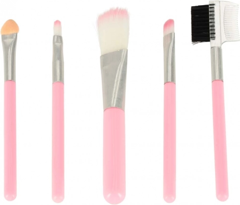 Cinq pinceaux différents avec manches roses et viroles métalliques sont idéaux pour une application efficace du maquillage.