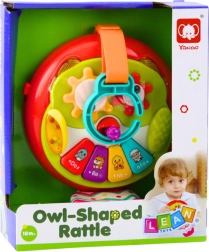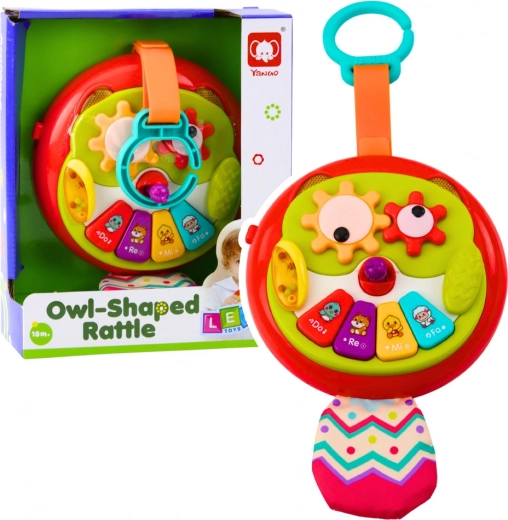 Sur le ventre de la chouette se trouve un petit piano coloré avec des notes qui, lorsqu’on appuie sur les touches, joue des mélodies agréables, favorisant le développement de l’ouïe et la capacité à distinguer les tonalités. La queue de la chouette est faite d’un matériau bruissant qui stimule à la fois le toucher et l’ouïe. Le jouet est équipé d’un attache qui permet de le fixer à une poussette, un lit bébé ou un siège auto. Le jouet est alimenté par deux piles AAA (non incluses) et, grâce à son format compact, il est idéal pour les déplacements.