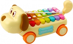 - Chien roulant, cymbales musicales, oreilles et queue mobiles, baguette avec ficelle